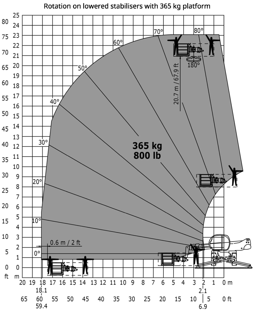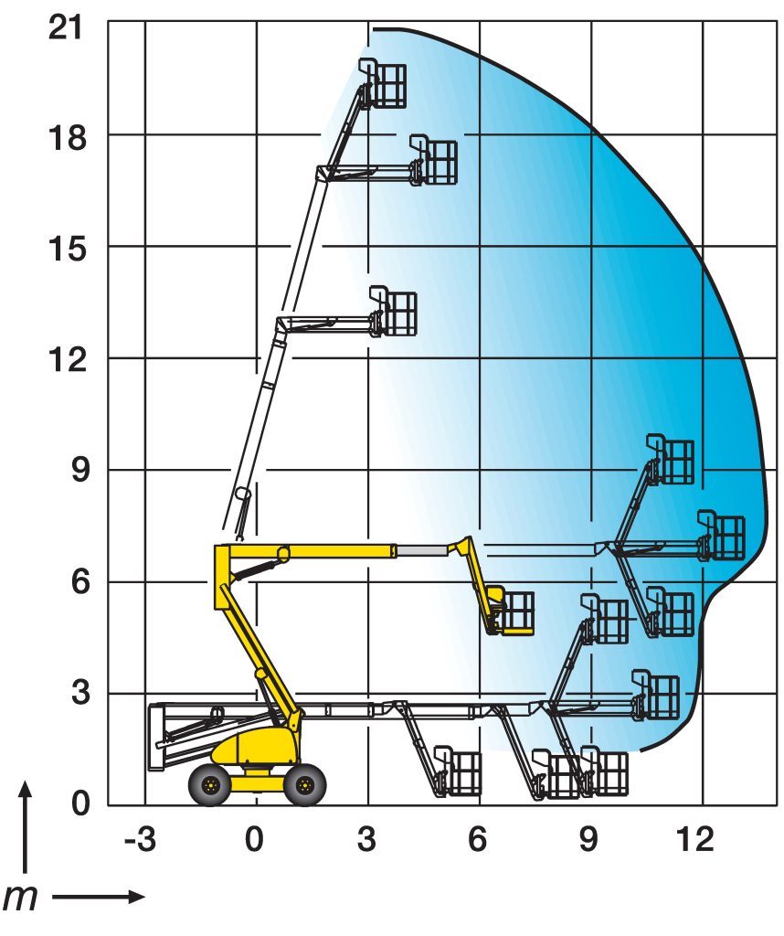 La capacité de charge maximale de nos nacelles 20 m est de 230 kg, soit deux personnes ainsi que leur équipement de travail. Nos nacelles 20 m sont compactes et donc idéales pour intervenir dans des endroits exigus en extérieur comme en intérieur. Pour l’utilisation en extérieur, ces nacelles résistent à des vitesses de vent pouvant atteindre 45 km/h. La tourelle s’oriente sur 360° en continu.